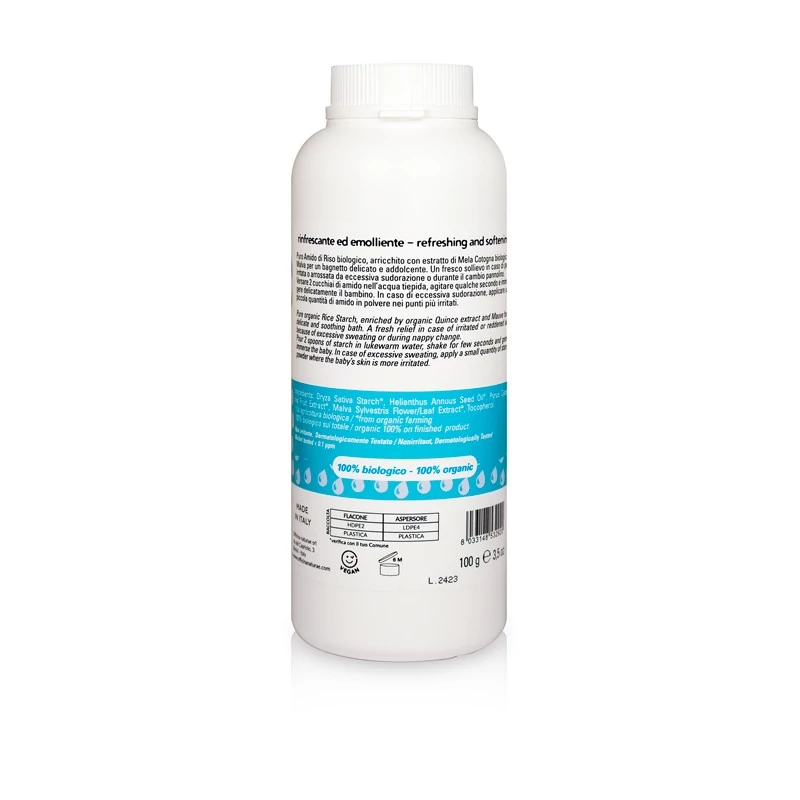 Appena nato, il tuo bimbo ha una pelle delicatissima. L’amido di riso biologico è ideale per un bagnetto rilassante e dolce, che calma e rinfresca la pelle del neonato. Ha un’azione ammorbidente e lenitiva, specialmente se la pelle è irritata da eccessiva sudorazione o arrossata da contatto con il pannolino.