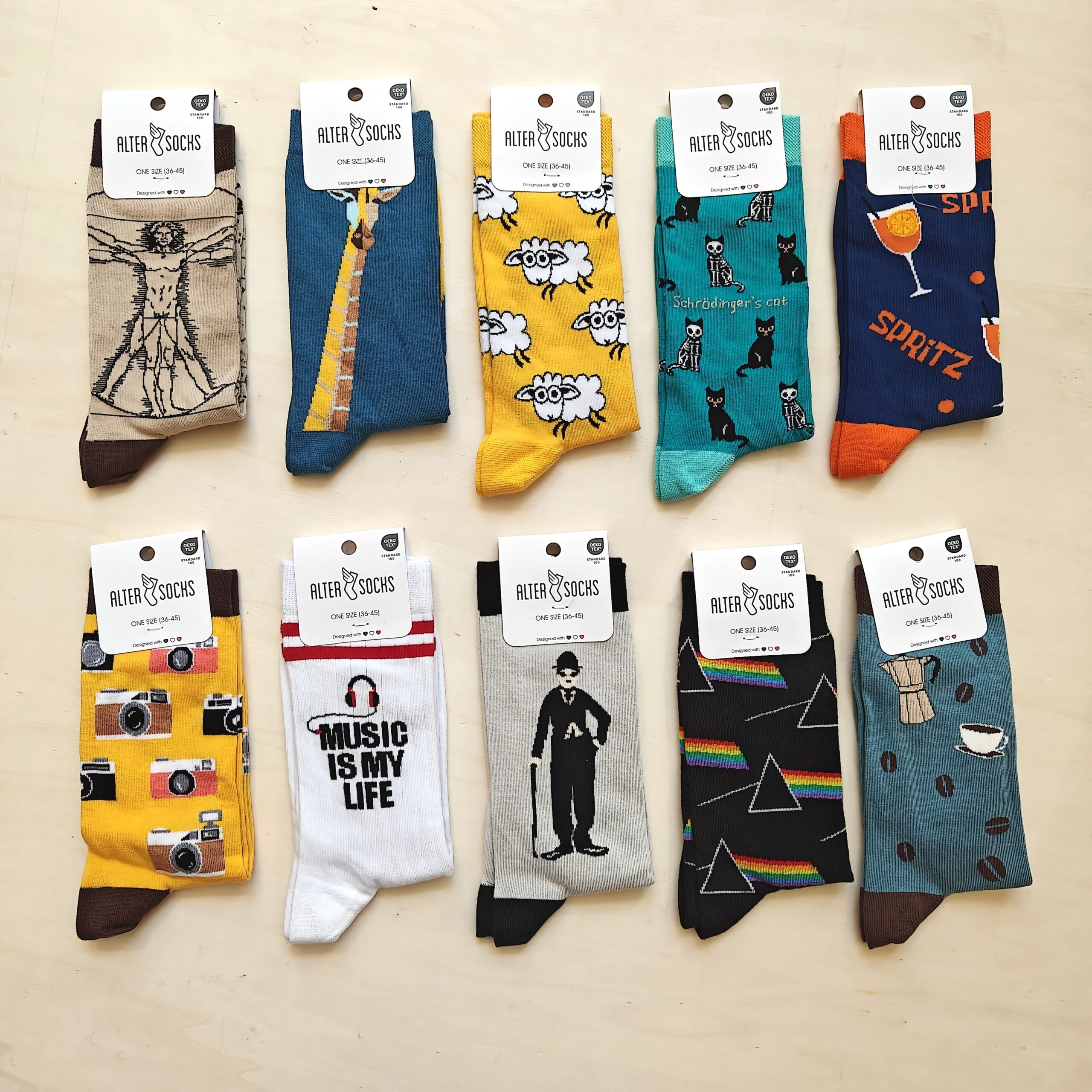 Calzini in cotone dal design simpatico e originale, che si adattano ad ogni personalità e umore. Realizzati in cotone di alta qualità certificato OEKO-TEX, dai colori vibranti e dalle fantasie più diverse. Hanno una vestibilità al polpaccio che copre le taglie dalla n°36 alla n°45 per gli adulti e dalla n°31 alla n°35 per i bambini. Ogni paio di calzini è stato pensato per portare allegria ad ogni passo durante tutta la giornata!