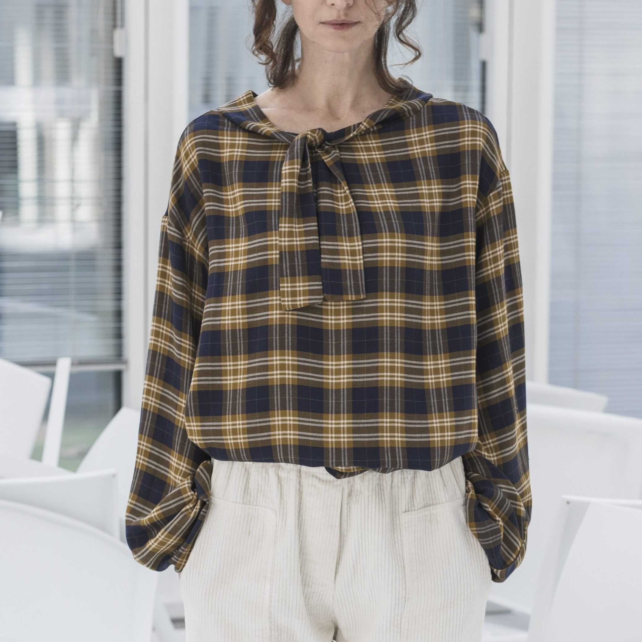 Se vuoi avere uno stile casual ed elegante ti consigliamo di abbinare alla camicia con fiocco i Pantaloni chino in velluto di cotone biologico e la Cartella con tracolla MN upcycled.