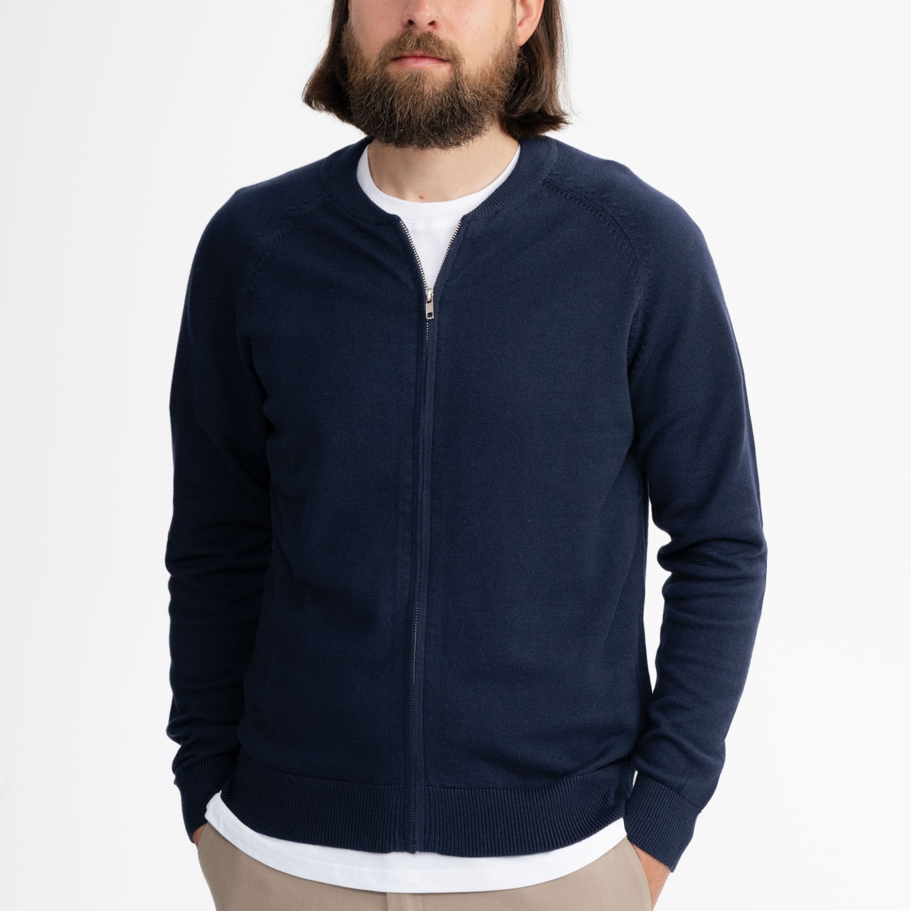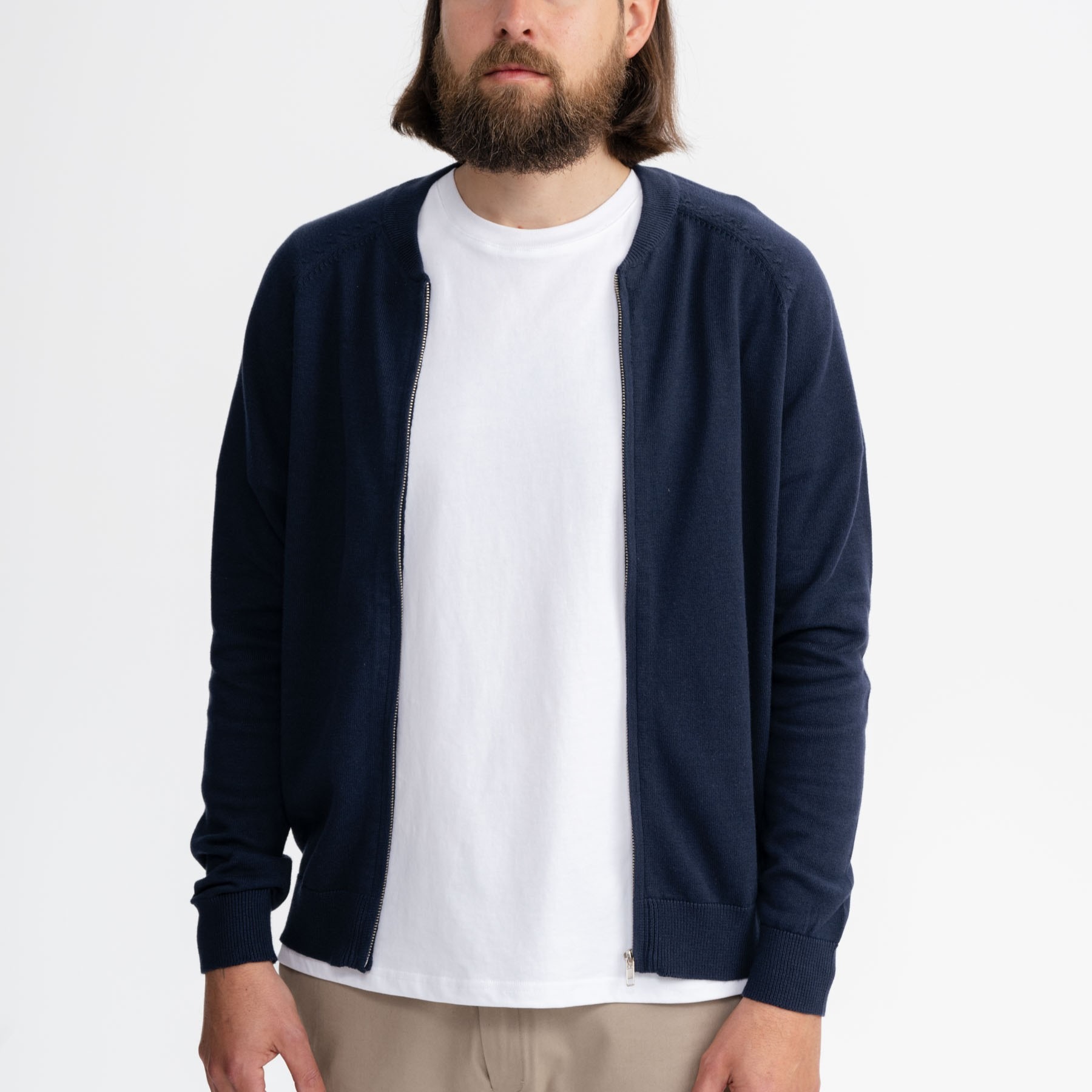 Morbido cardigan con cerniera da uomo, realizzato in 100% cotone biologico. Versatile e comodo, potrai utilizzarlo sopra una semplice maglietta. Questo cardigan è leggero e presenta una lavorazione semplice, impreziosito da un colletto basso che lascia libertà di movimento.