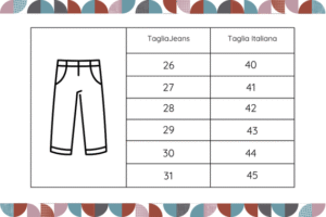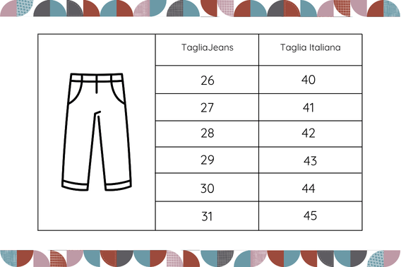 Il jeans donna Straight Rose ha una vestibilità regolare, ti consigliamo la taglia giusta o la mezza taglia in più! Come posso capire qual è la mia taglia? La taglia dei jeans è espressa in pollici: sostanzialmente la taglia indica la misura della vita del modello in pollici (1 pollice è circa 2,45 cm). Ad esempio la taglia 25 significa che la vita dei jeans misura 25 pollici, che espressa in cm è di circa 63,5 cm. Se ti sembra complicato, ecco come puoi fare! Alla taglia indicata in pollici aggiungi +14: otterrai la conversione nella taglia italiana! Questo sistema è molto utile perché permette di avere disponibili anche le mezze taglie italiane.