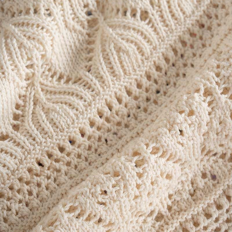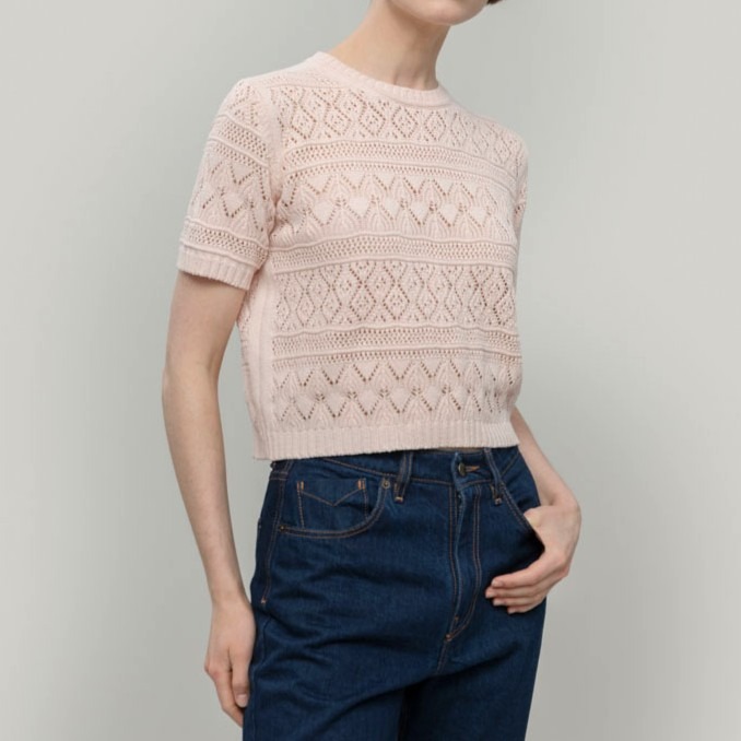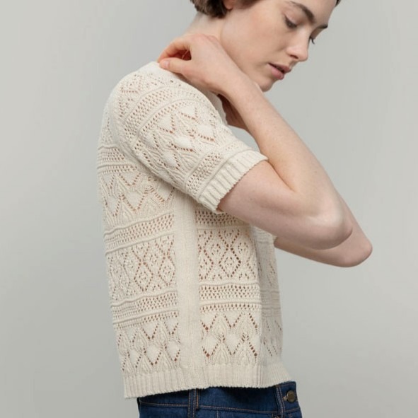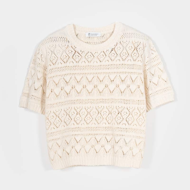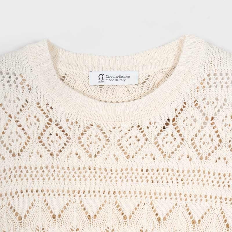 Il design è arricchito da una raffinata lavorazione traforata che combina diversi motivi geometrici, creando una trama dinamica e ricca di dettagli. Questa particolare texture non solo dona alla maglia un aspetto distintivo, ma la rende anche fresca e piacevolmente traspirante, ideale per essere indossata nelle stagioni più miti.