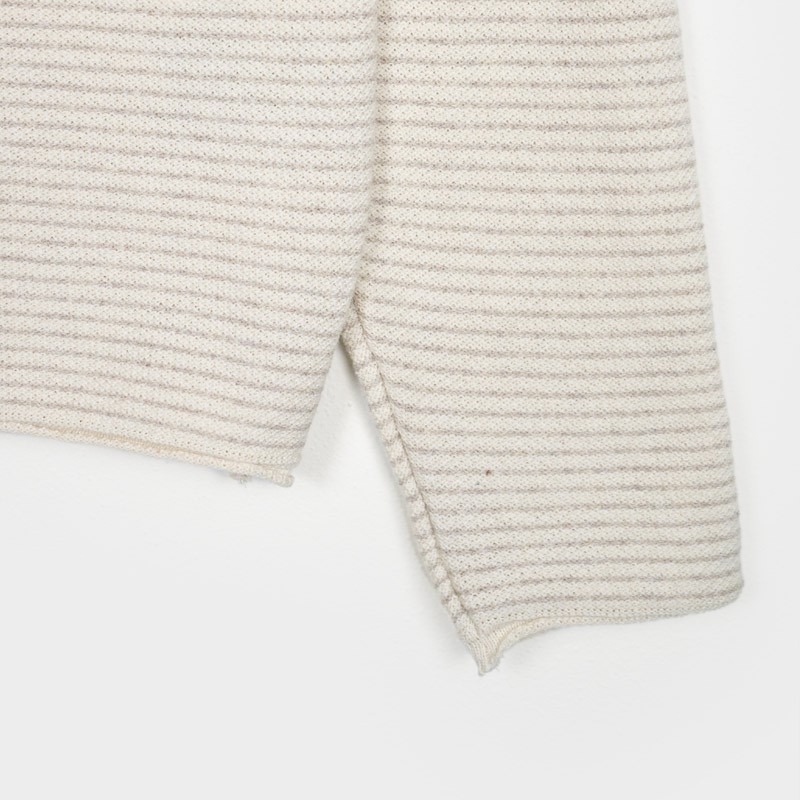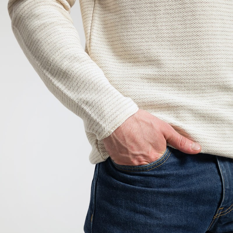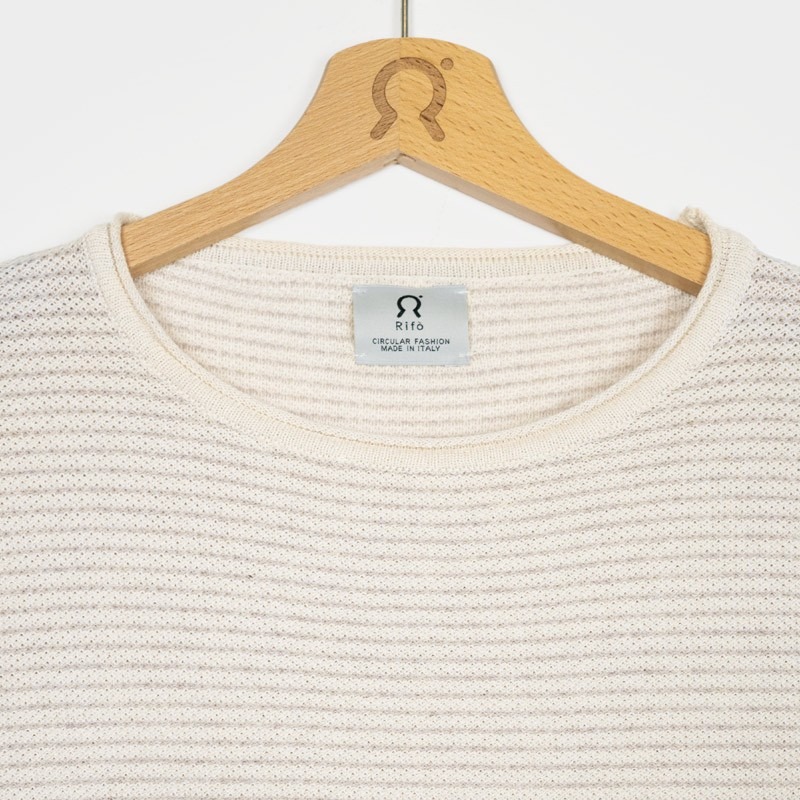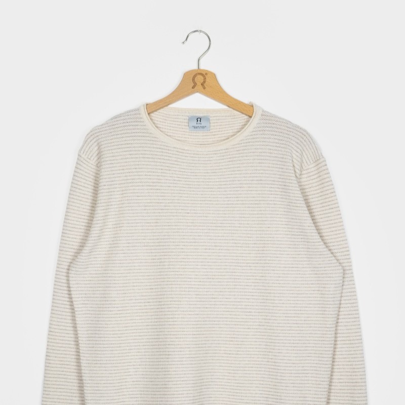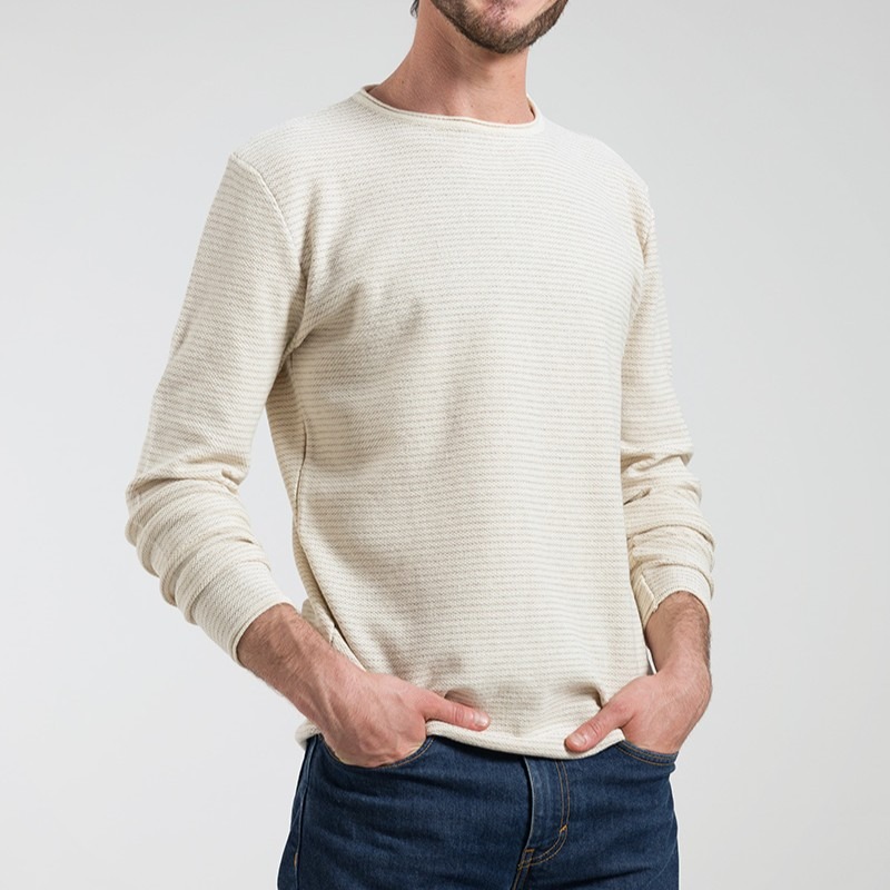 Il maglioncino in cotone rigenerato Noa èè un modello girocollo a maniche lunghe da uomo. Fantasia con micro righe realizzate direttamente in tessitura. Un capo versatile e adatto sia per la mezza stagione che da utilizzare sotto a cardigan e giacche. Polsi e fondo con bordo loose.