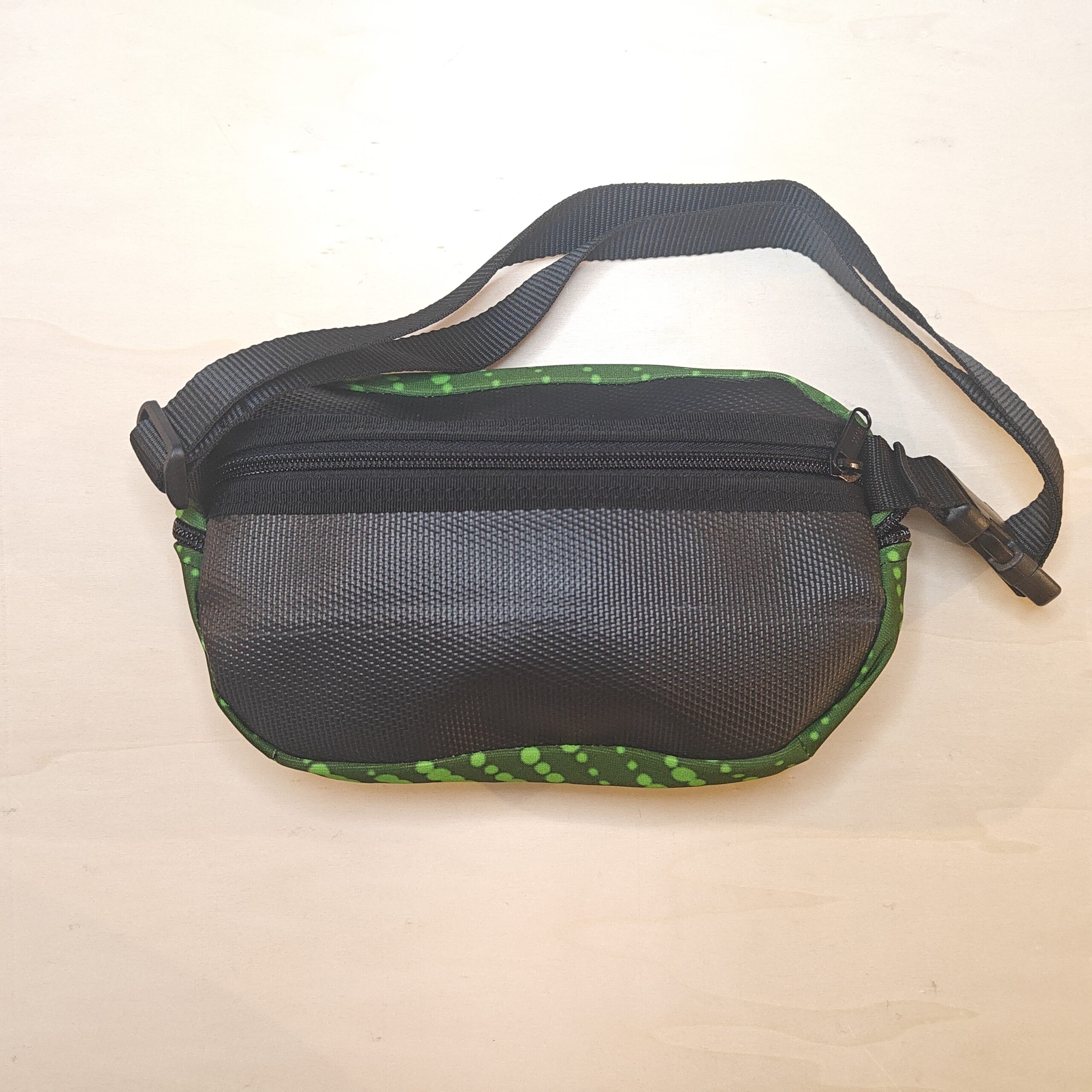 Presenta una cerniera frontale che dà accesso alla tasca principale e una seconda cerniera sul retro che apre una tasca aggiuntiva. La cintura per legare il marsupio è regolabile.