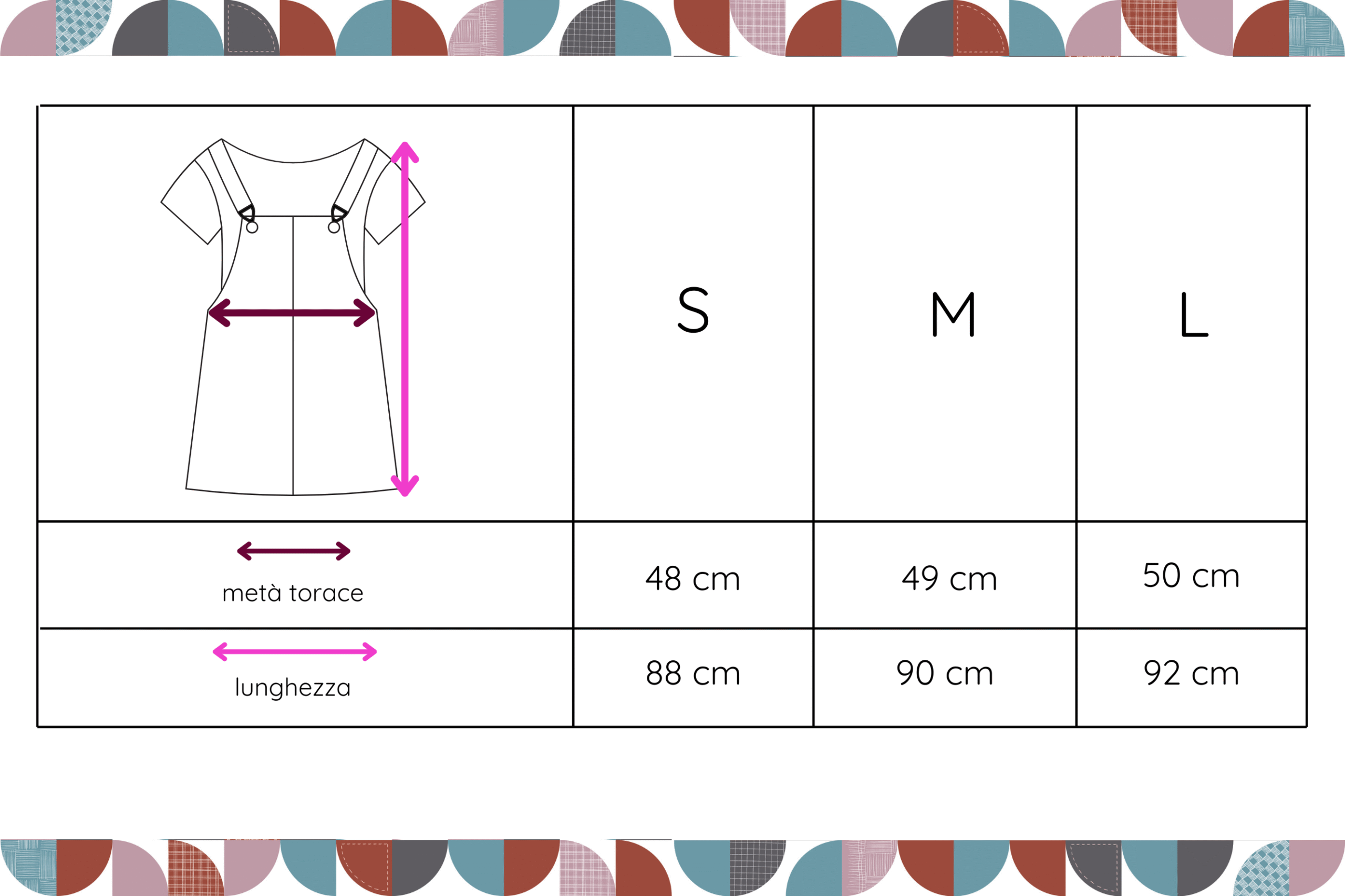 La salopette ha una vestibilità comoda che non segna il corpo. Ti consigliamo di scegliere la tua taglia abituale.
